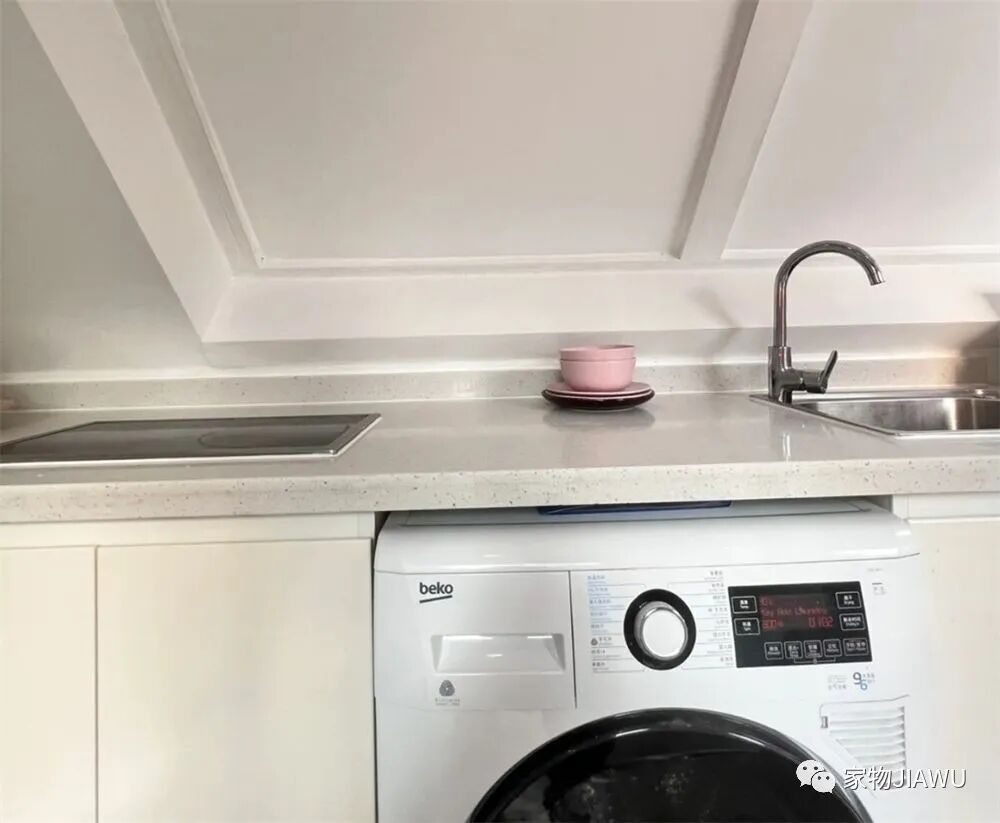 推门进入家中,左手边是一个开放式厨房,下面嵌入了包括冰箱在内基本生活厨电,就连洗衣机也嵌入其中,留出过道的动线,显得干净整洁、一体感更强。