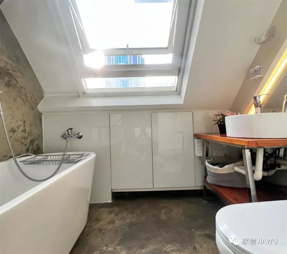 而卫生间则用玻璃门进行隔断,内部不仅留出了浴缸的沐浴区,还有一扇斜顶大窗,给卫生间带来了优秀的采光和通风,让这个卫生间变成一个舒适的明卫。