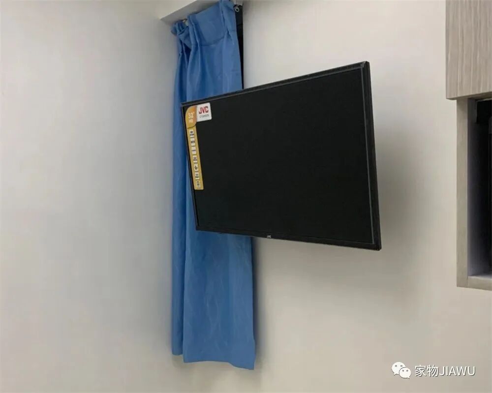 最后,床尾的地方安装上一台壁挂电视,给这位小哥提供了一个简单的观影追剧的休闲区域,空间利用还是蛮合理的~