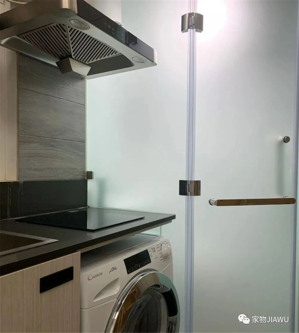 橱柜紧贴浴室磨砂玻璃间安装,因为有安全方面的规定,所以直接用电磁炉代替传统灶台,既能满足简单的烹饪需求,同时也节省了一定的空间,方便在底部嵌入洗衣机。