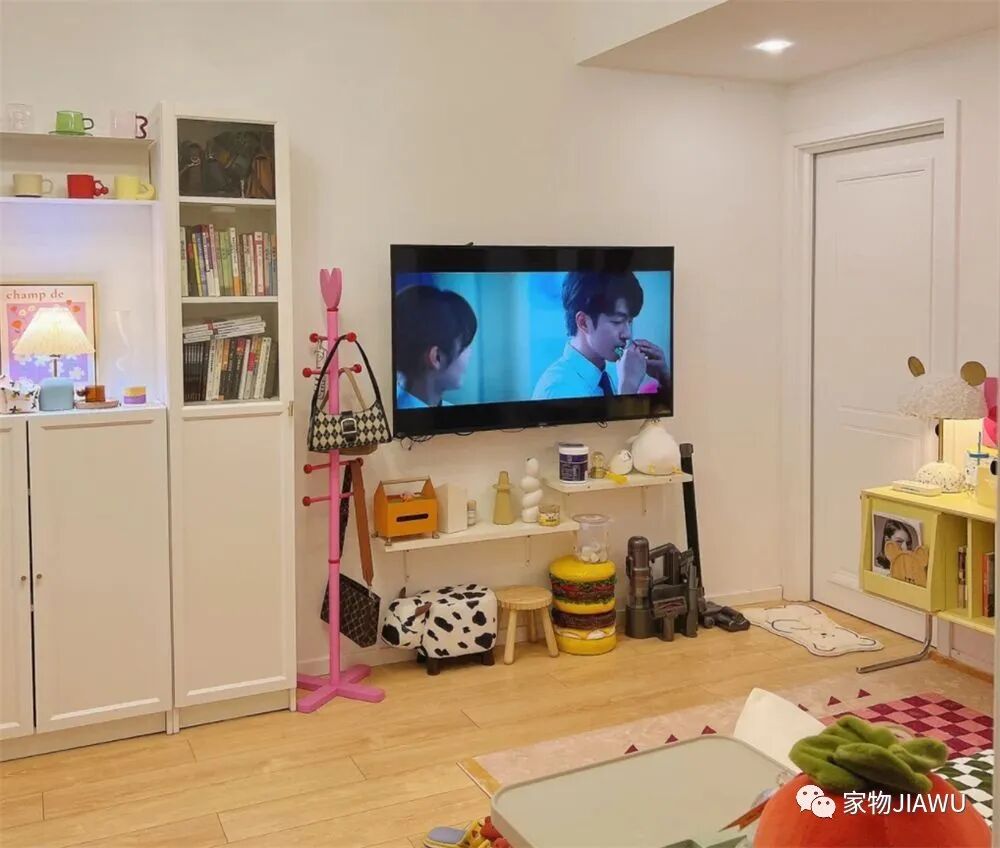 电视墙也是尽可能简单,只是用壁挂电视搭配两层隔板架,来代替传统的电视柜,既节省了装修预算,又节省了一定的空间,下面还能放一些小凳子等东西。
