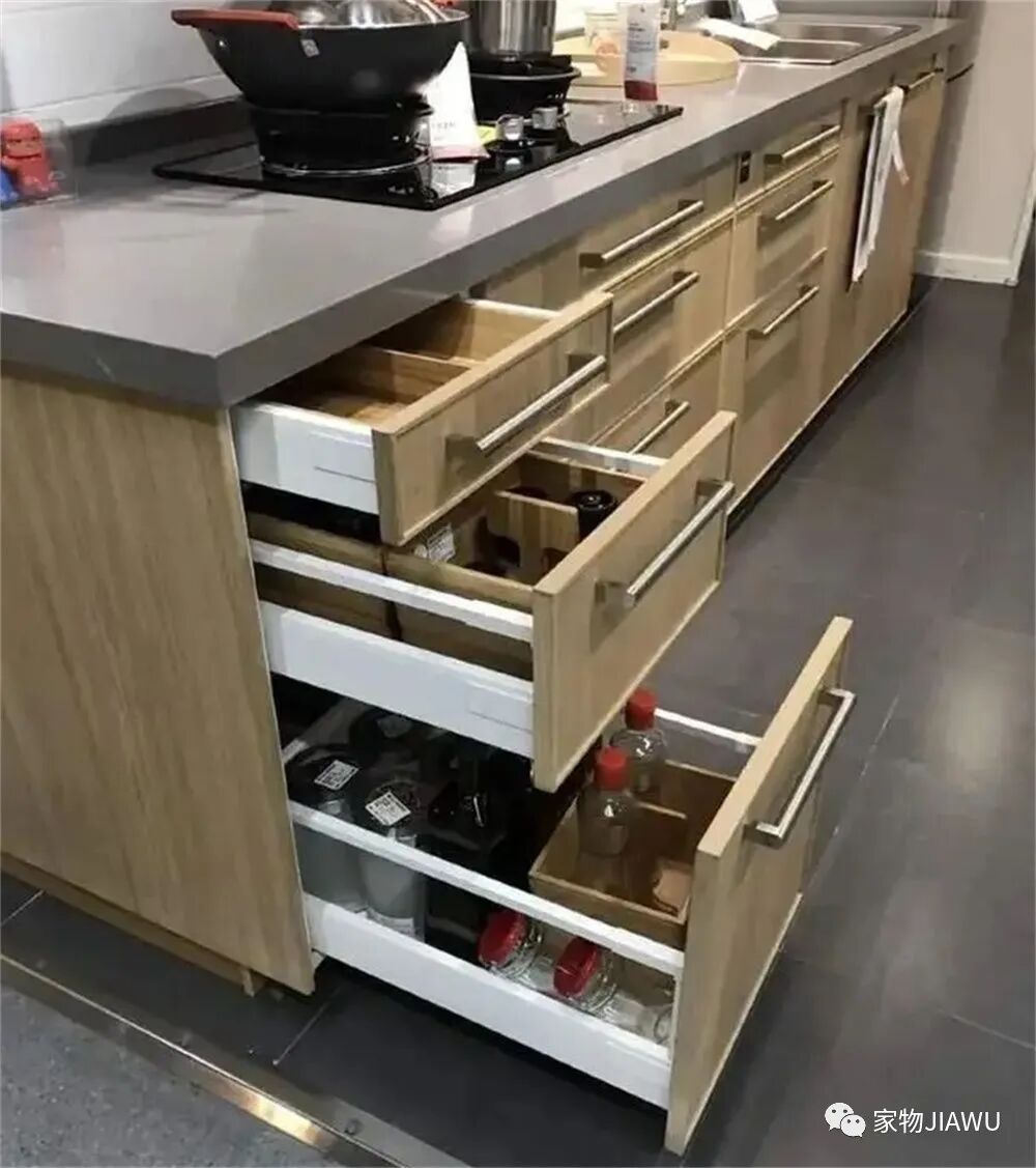 厨房的橱柜,抽屉做少真的很难受,很多东西用橱柜柜格收纳会显得非常杂乱,拿取也不方便,而用抽屉收纳的话,则要方便很多,抽出抽屉,里面收纳了什么都一目了然。