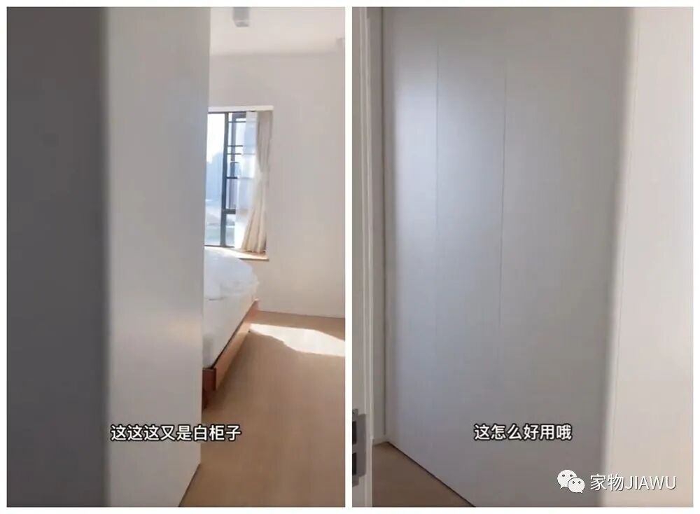 而进入主卧,这位姑娘用白色的柜子隔出一个小小的衣帽间,也让长辈觉得家里都是这种白色的柜子,显得太过单调寡淡,总之,长辈给的评语就是三个字儿——不好看。