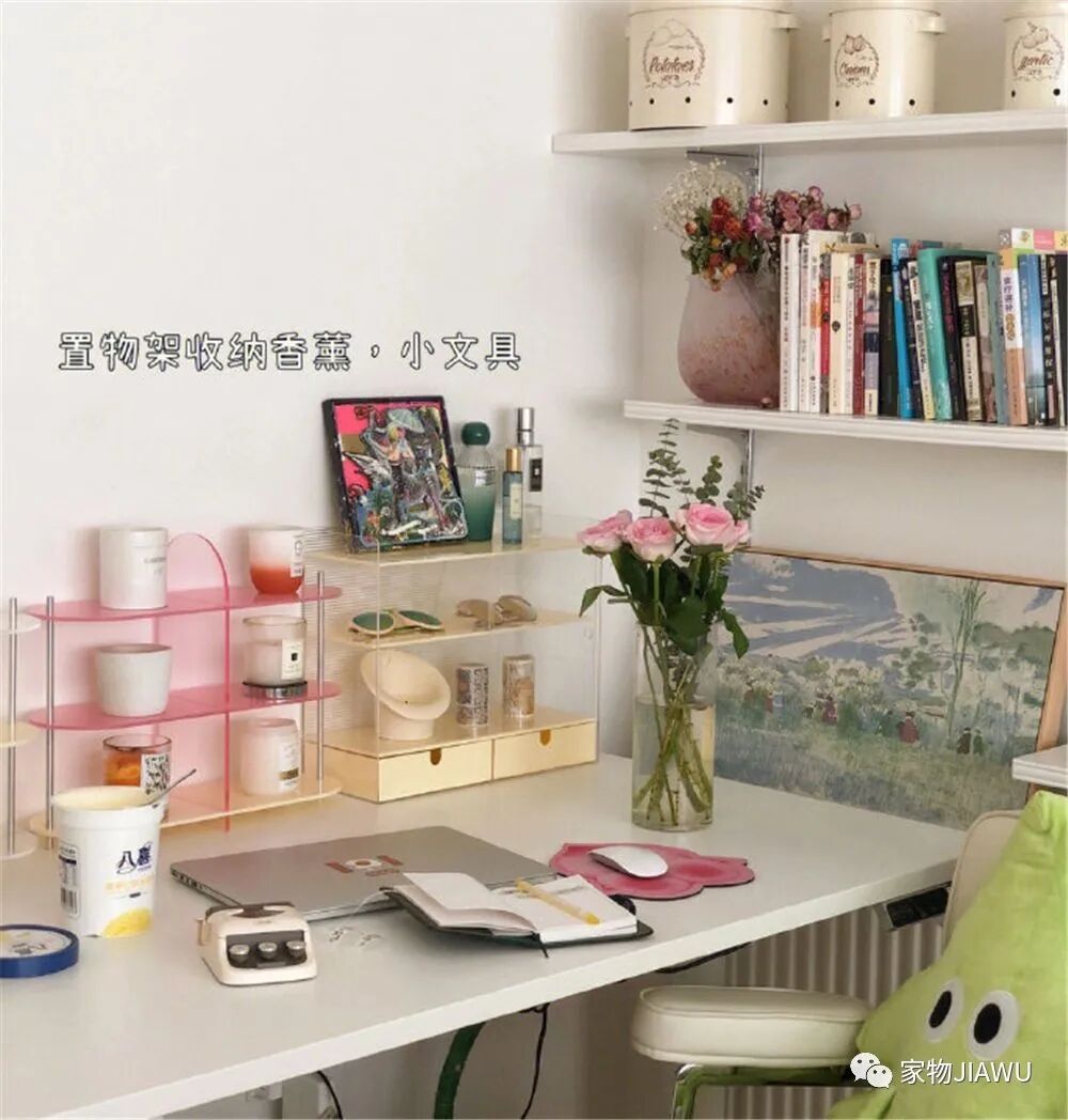 桌面上用这种亚克力的收纳架,摆放香薰和一些文具摆件,适当的留白让办公桌显得高级感满满,同时也有足够的桌面工作空间,我个人觉得布置得还是蛮实用的。