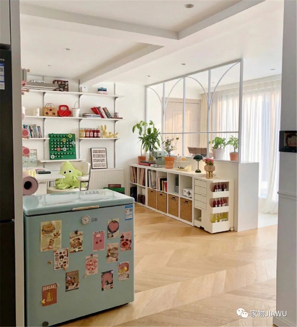 从这处开放式的办公区,也可以看到客厅中的景象,让本来不算大的空间,显得格外通透舒适,这种半开放的格局设计,真的爱了。
