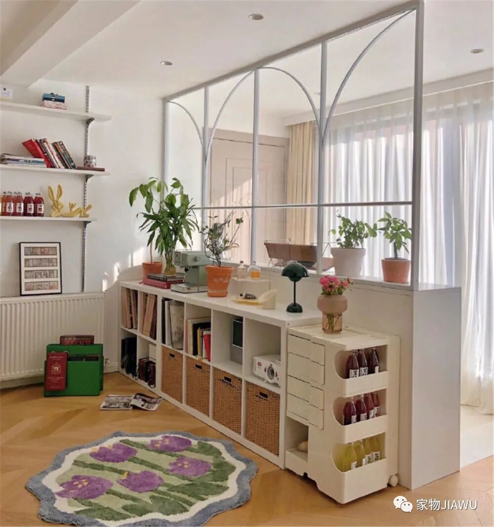 书桌后面,上半部分是玻璃隔断墙,下半部分用矮柜打造出一个小型的收纳区,收纳各种书本和生活杂物,台面上再用绿植和摆件进行装饰,看起来生机勃勃。