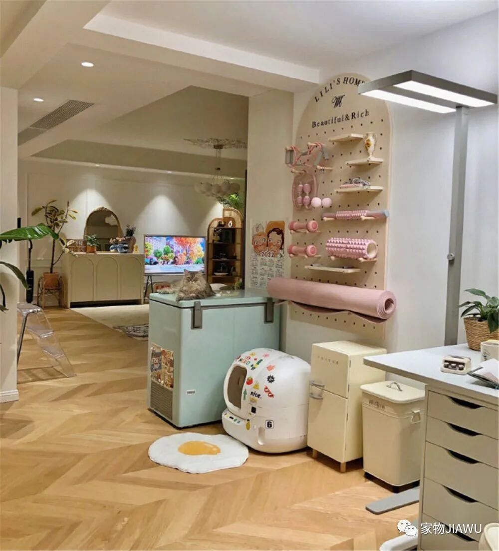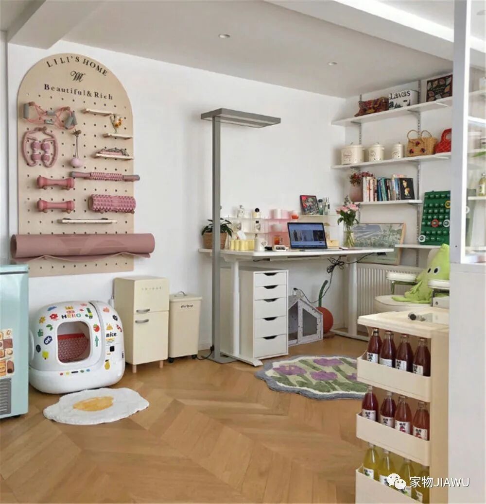 哦对了,旁边的空余位置,她利用拱形的洞洞板搭配隔板架,收纳瑜伽健身的一系列器材,下面摆放猫砂盆,将空间充分利用。