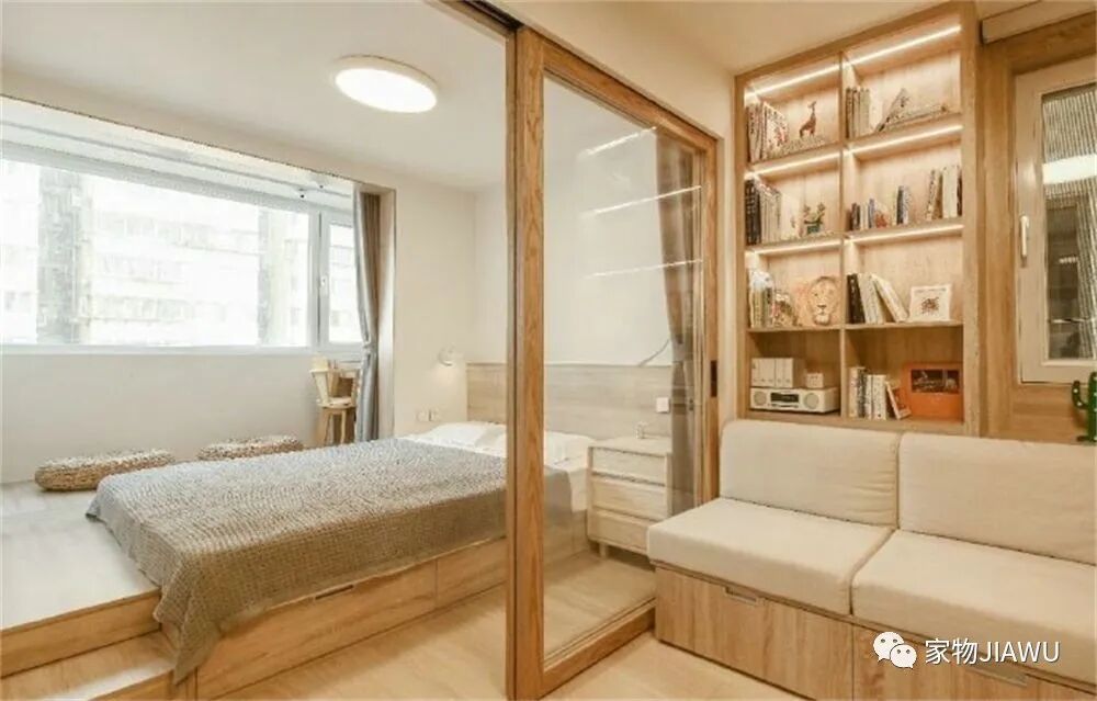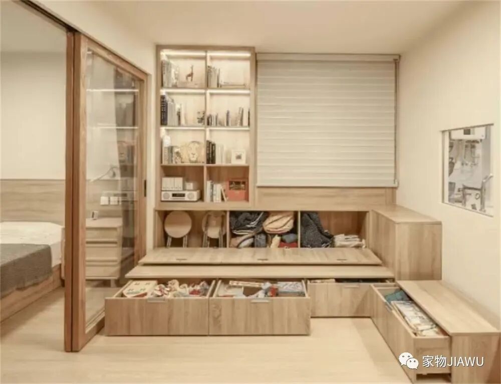 这间卧室利用架高地台的方式,打造出榻榻米床铺,床下收纳各种各样的生活杂物,将纵向空间充分呢利用起来。