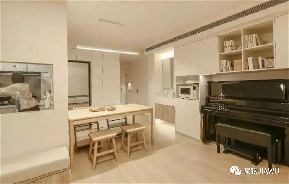 里面的厨房面积也很小,但做了内窗增加采光和通透感,再将冰箱外移,使用起来会舒服很多。