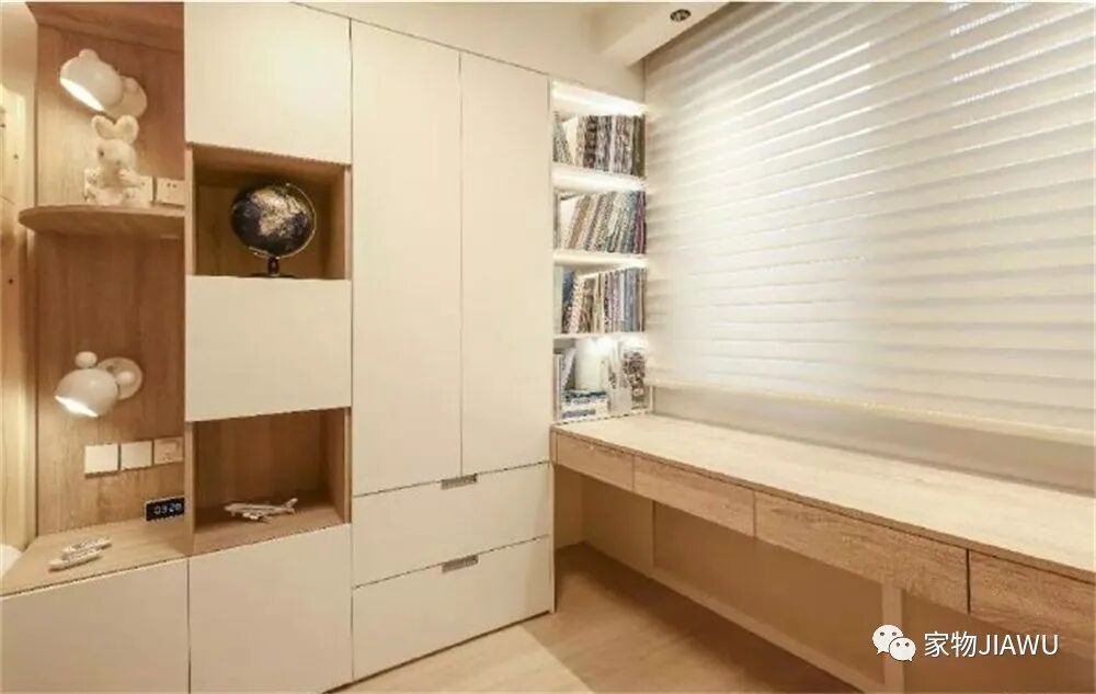 即便是柜子和书桌夹角的位置,也做了通顶式的书架,用来收纳孩子们的诸多书本杂物,同时起到一定的摆设的作用,也是一个不错的装修设计。