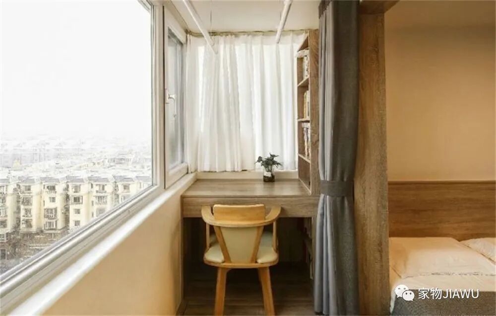 而靠近阳台的位置,则做了一个小小的书桌,可以将这间卧室当作主卧书房使用。