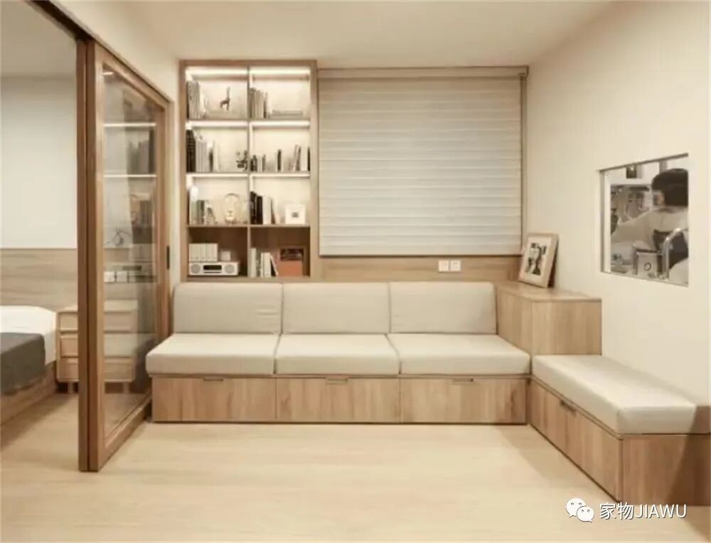 你以为客厅的沙发只是眼前看到的这样?实际上,沙发的靠背和底部空间,也都加入了收纳抽屉、柜格,可以收纳一些换季的衣物和家里的小件杂物,让室内空间更显整洁。