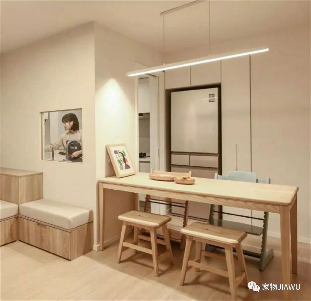餐厅采用窄餐桌填补空间,打造出一个相对宽敞的四人位用餐区,同时也留出了虽然窄小,但却足够的动线,不会影响到进出的便利性,个人感觉布置得还算不错。