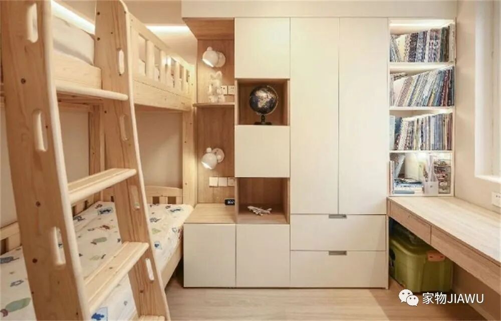家里的第二间屋子是儿童房,这里做成了上下铺的格局,一组衣柜放在墙面尽头,也做成通顶式,尽量利用起纵向空间。