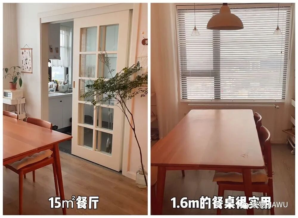 餐厅的面积差不多有15㎡,一张1.6米的四人位餐桌,能满足一家人日常用餐的需求,而且最关键的是,餐桌桌面保持“净空”的状态,完全不回显得杂乱。