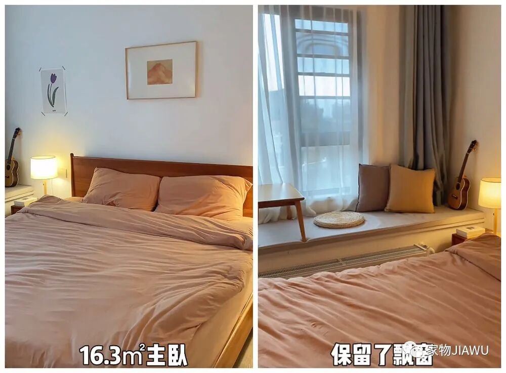 主卧的设计空间相对要大一些,有16.3㎡左右,保留了一开始的飘窗格局,做成小茶桌休闲区,平日里没事儿的时候坐在飘窗上喝喝茶,也非常舒服。