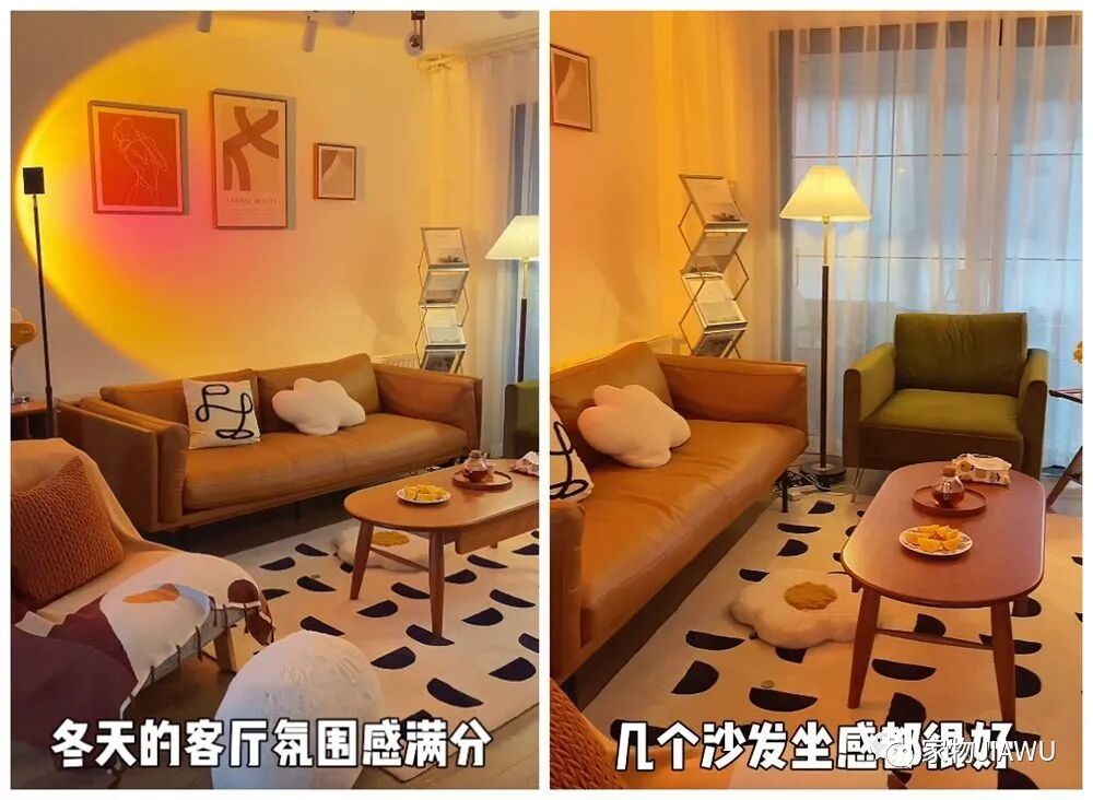 在客厅中,一盏落日灯营造出温暖的氛围感,尤其是在寒意满满的冬季,这样的光线设计让小家更显和煦。