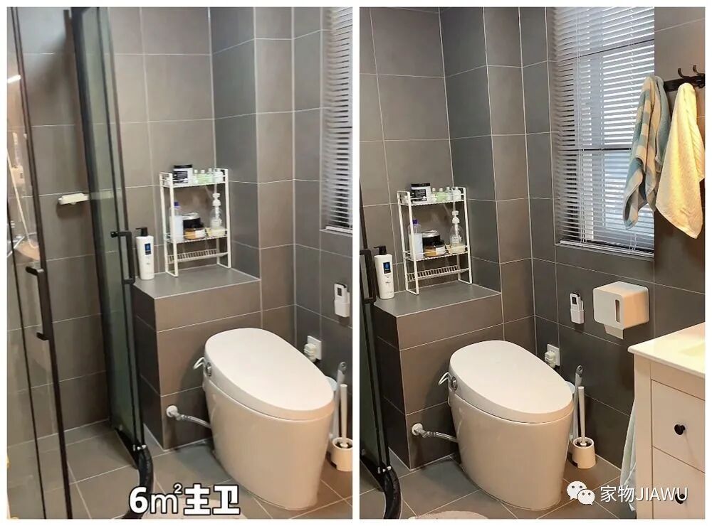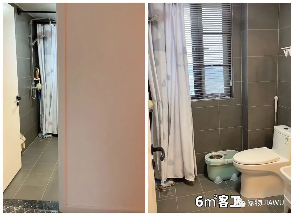 6㎡的空间并没有做硬隔断,而是用浴帘简单分隔干湿区域,倒也能满足基本沐浴需求。