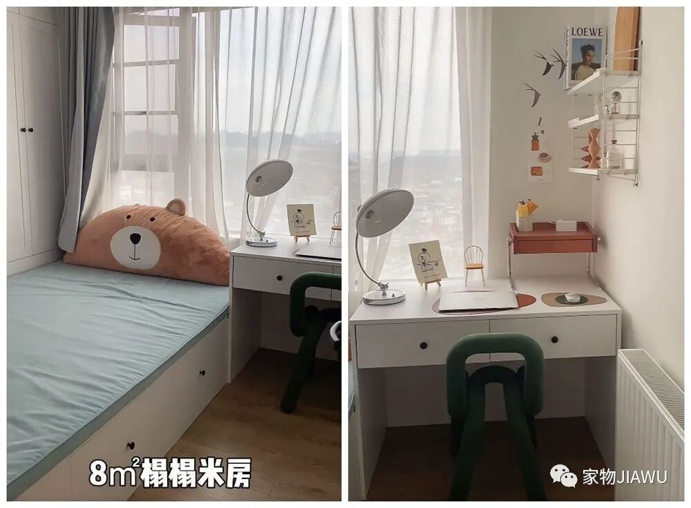 另一间客卧则打算日后作为儿童房实用,做了整体的榻榻米和一体化的书桌,提供睡眠、学习、收纳等功能,将角落空间充分利用起来。