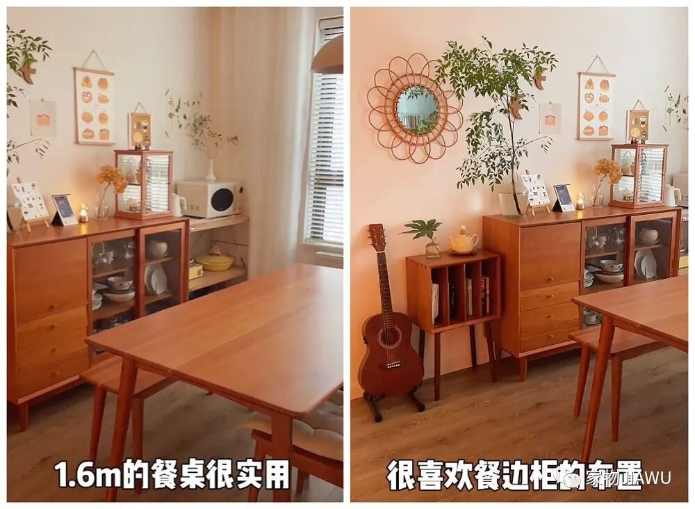 至于本应在餐桌上的一些瓶瓶罐罐、碗碟器具或者是装饰用品,则被移到了墙边的餐边柜中,通过抽屉和柜格进行收纳,也让餐厅区域显得整洁有序。