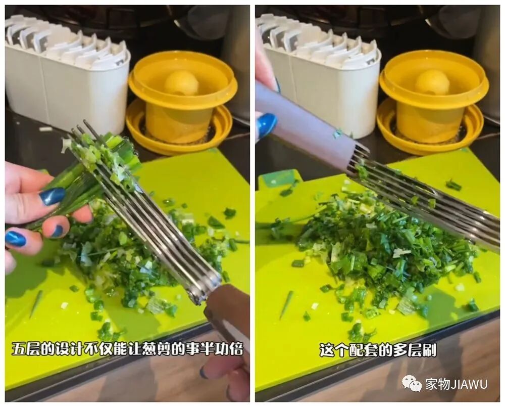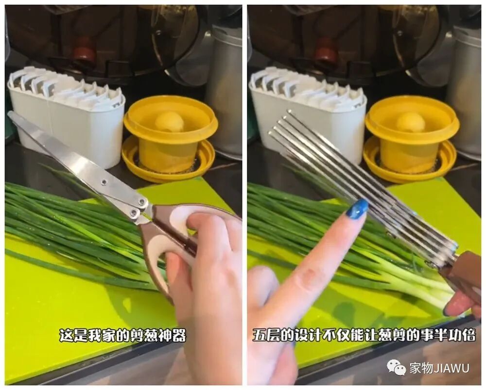 如果嫌切葱花费事费力的话,也可以试试这种切葱丝剪刀,它其实相当于五个剪刃堆叠,能够轻松完成切葱花的工作。