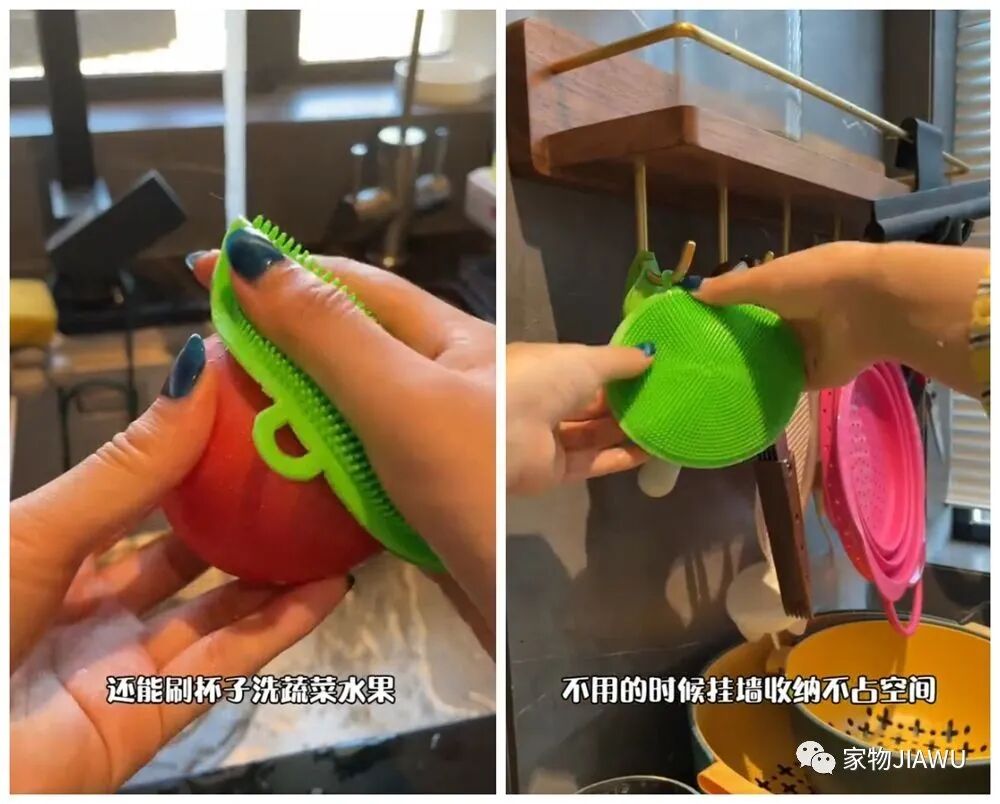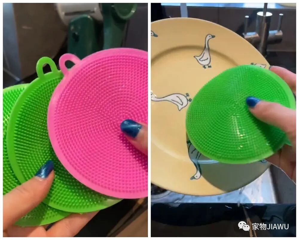 这个圆形的多功能刷采用柔软的硅胶材质,上面有凸起的短刷毛,洗碗碟、刷杯子都可以用到,柔软的材质不会对釉面造成伤害。