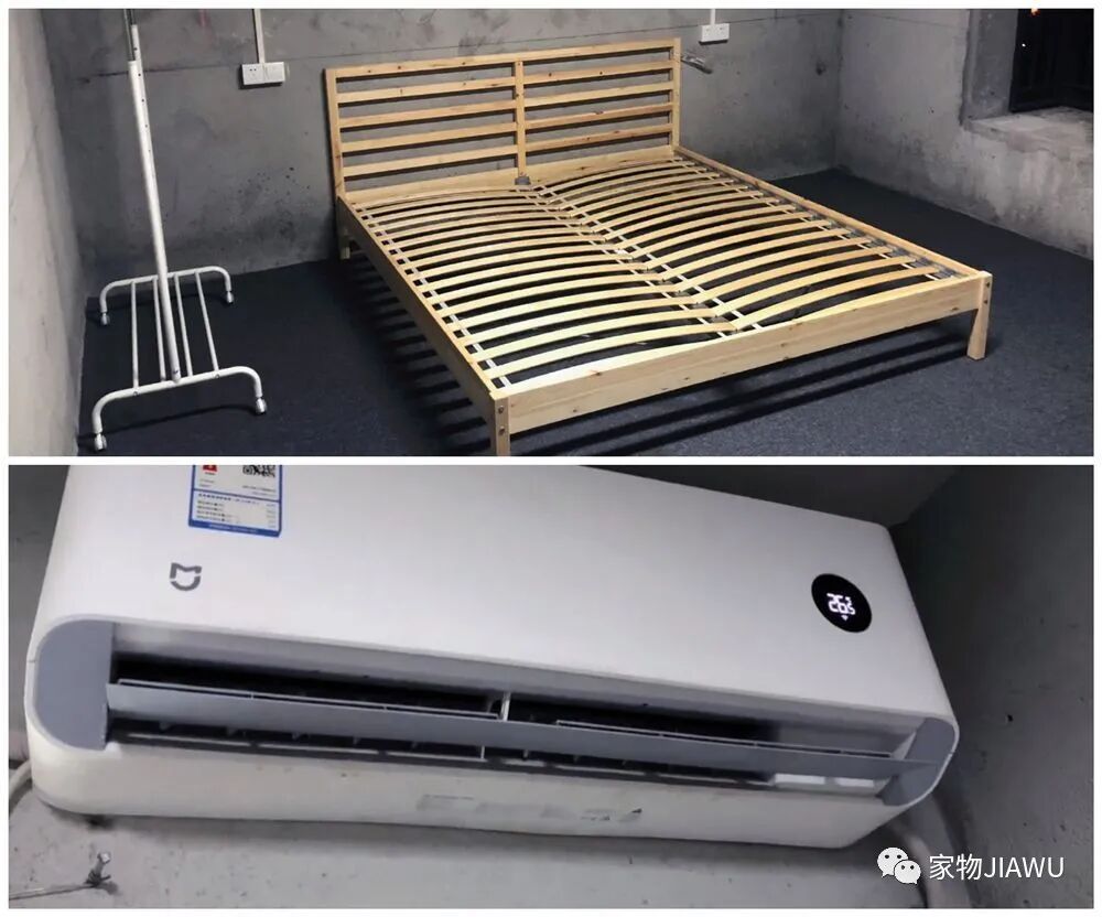 又如卧室,床架和空调都是打折时买来的,一定程度上节省了预算,也满足了基本的功能。