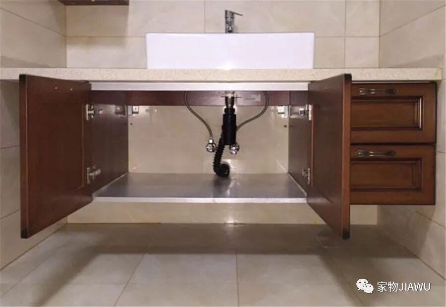 做完墙排式下水以后,还可以做一个底部收纳橱柜,既可以遮掩排水通道,又可以提供额外的收纳空间,侧边也可以做开放柜格,提升收纳能力。