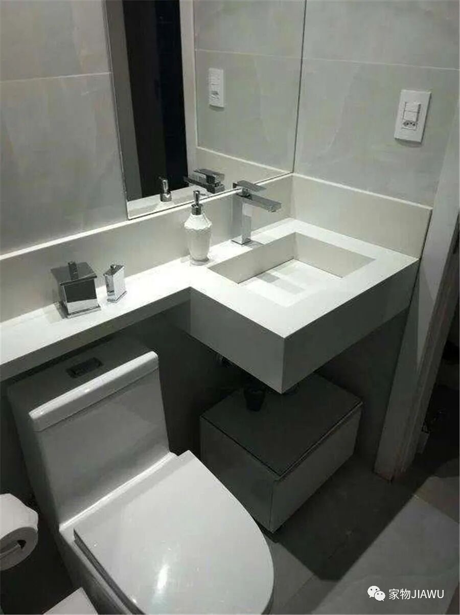 如果空间格局允许,可以将台面空间延伸,做出一个台面收纳空间,能够放置额外的卫生间物品。