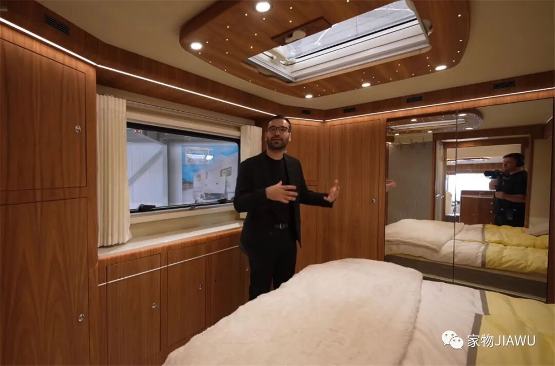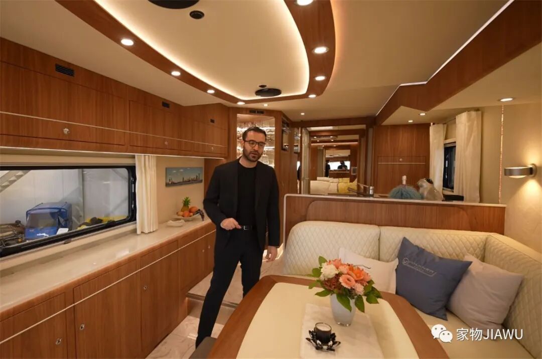 这辆房车堪比一个五星级的移动式酒店,全部展开后,内部面积大概有30㎡左右,客厅、厨房、卫浴、卧室,一应俱全,甚至还带一个小车库!