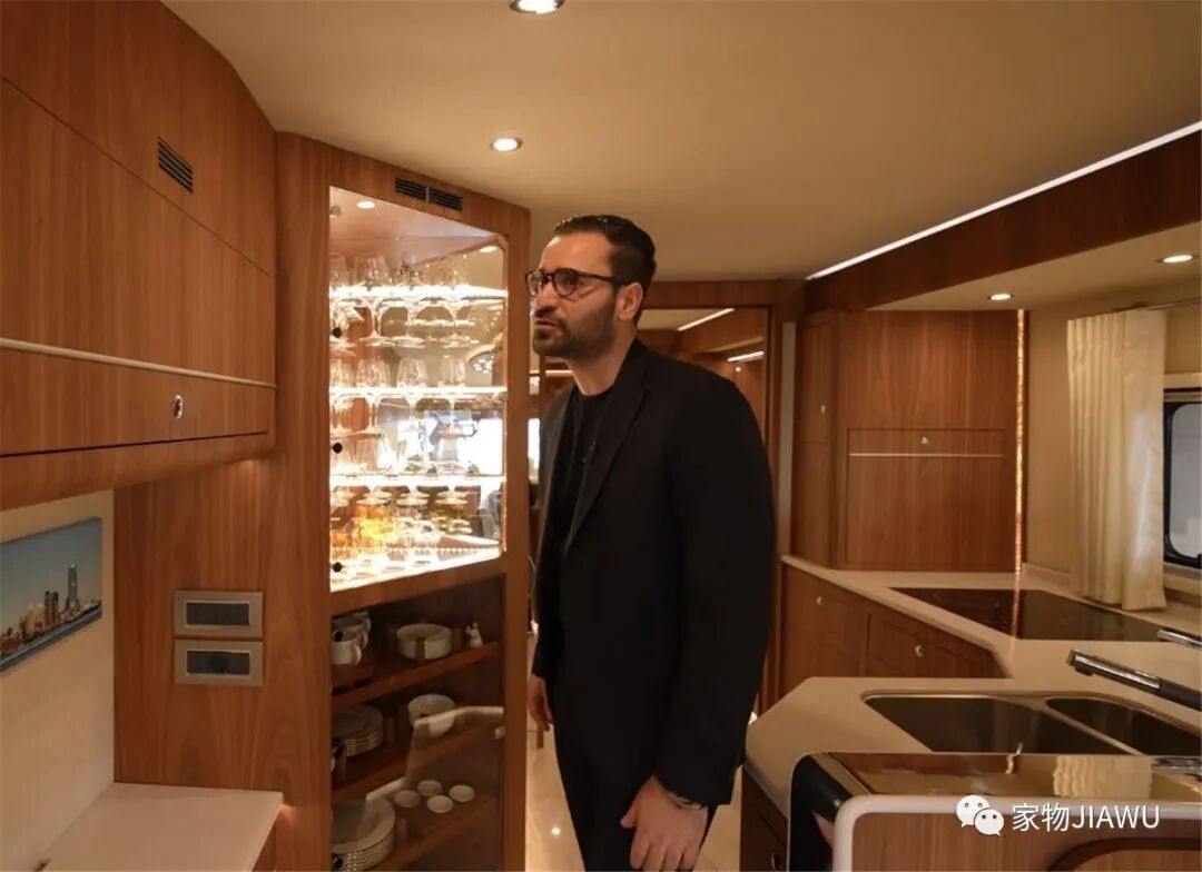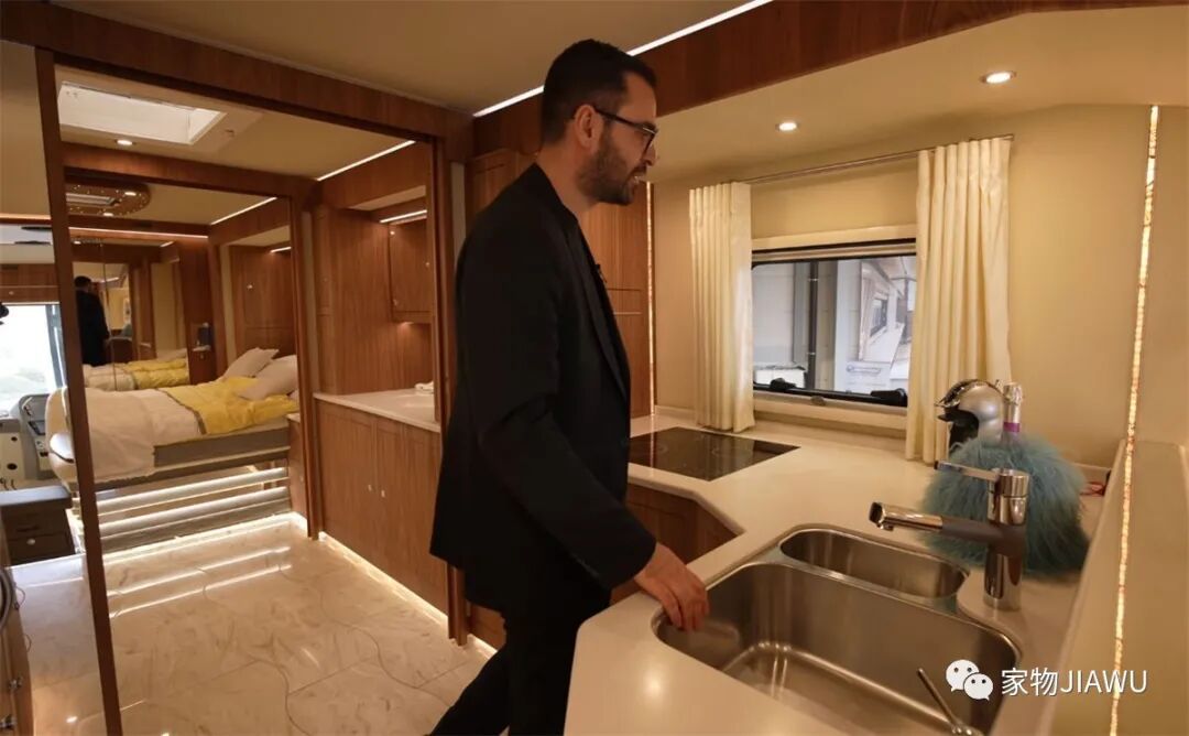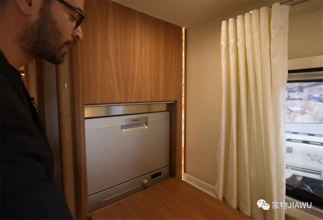 而旁边甚至还隐藏了一台洗碗机,可以说把家中厨房的电器全部搬到了车上。