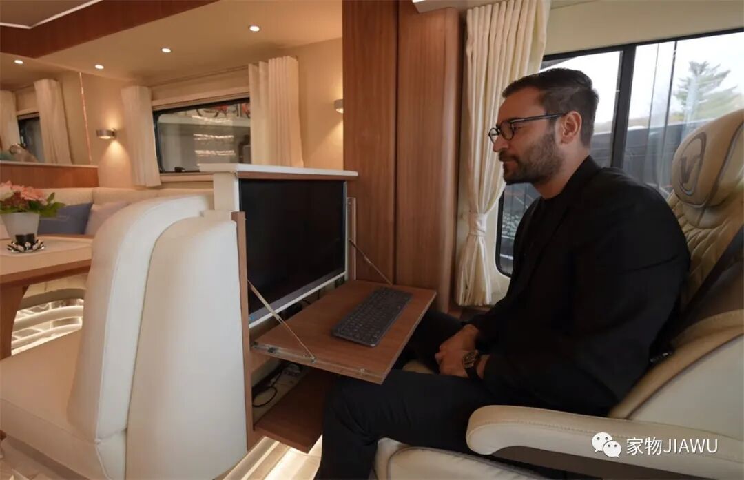 这辆房车的驾驶位,其实是可以360°旋转的,转过身来以后,后面是一个小小的吧台区域,上面带有升降的小电视和折叠桌,方便在停驻时办公使用。