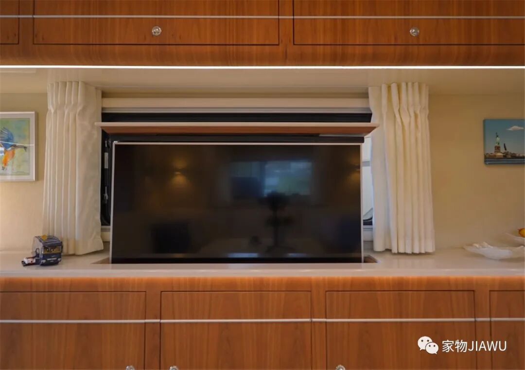 有趣的是,电视同样隐藏在了台面下,通过电动升降的方式展现,让客厅具备了沙发茶几电视柜的传统搭配。