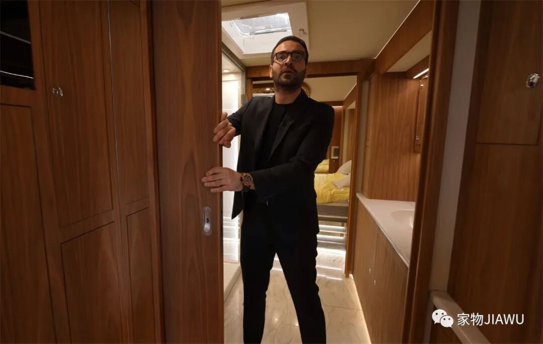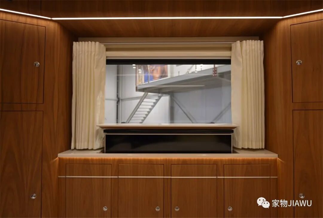 卧室除了入门那面的墙壁,其余三面都围绕着收纳柜,在收纳柜中也同样安装了电动升降的电视,既满足了卧室观影的需求,又提升了收纳空间。
