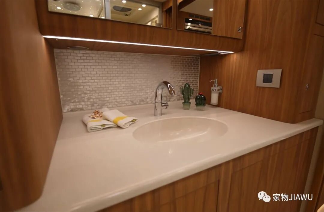 无论是洗手池,还是对面的卫生间和浴室,都比一般房车要大上很多,比起很多小公寓中的卫浴空间来说,也是不逞多让了。