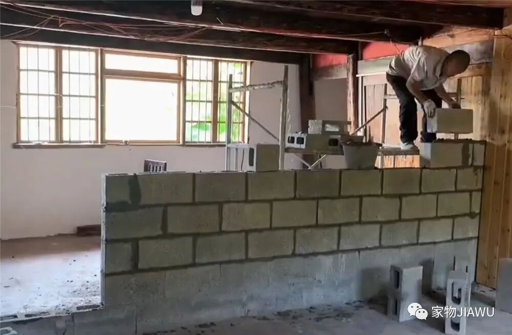 原本木屋是一个超大的空间,虽然空间相对来说宽敞一些,但却有些太过空旷,且利用不够充分,所以这次干脆在房屋中央砌起一堵墙,分隔出两个空间。