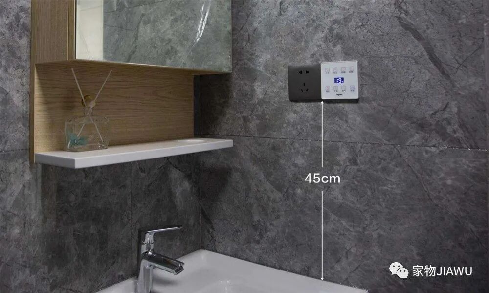 卫生间的洗手盆上方,建议大家也预留上两个插座,可以给带灯的智能镜,或者是吹风机等小电器供电,当然,为了安全考虑,最好是安装防溅插座哦~