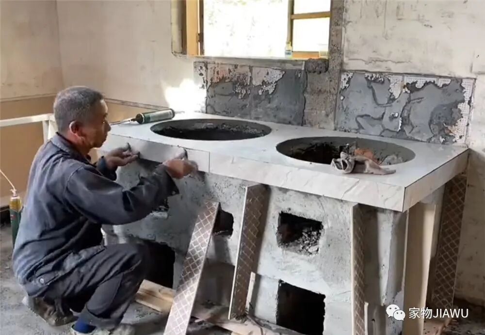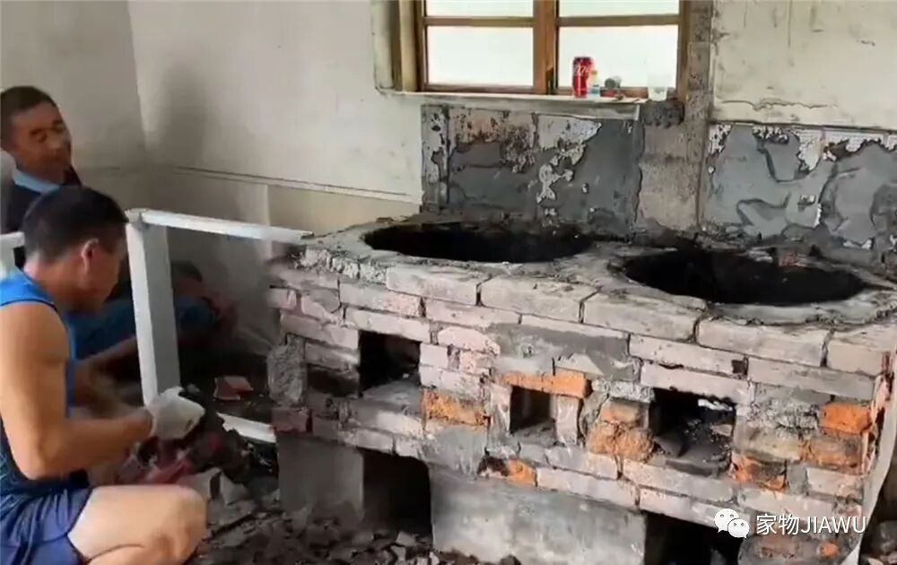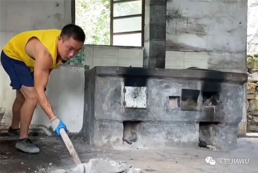 将灶台表面已经被熏黑的水泥打碎,露出内部的砖砌结构,后续会重新覆盖上新的水泥层和瓷砖,改变灶台被熏黑的样貌。
