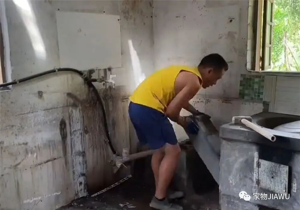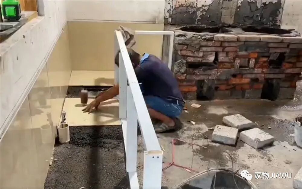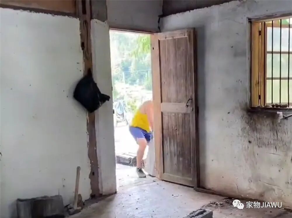 这位小哥先将原本厨房的水泥灶台拆除,并将被柴火熏黑的区域重新清理干净。