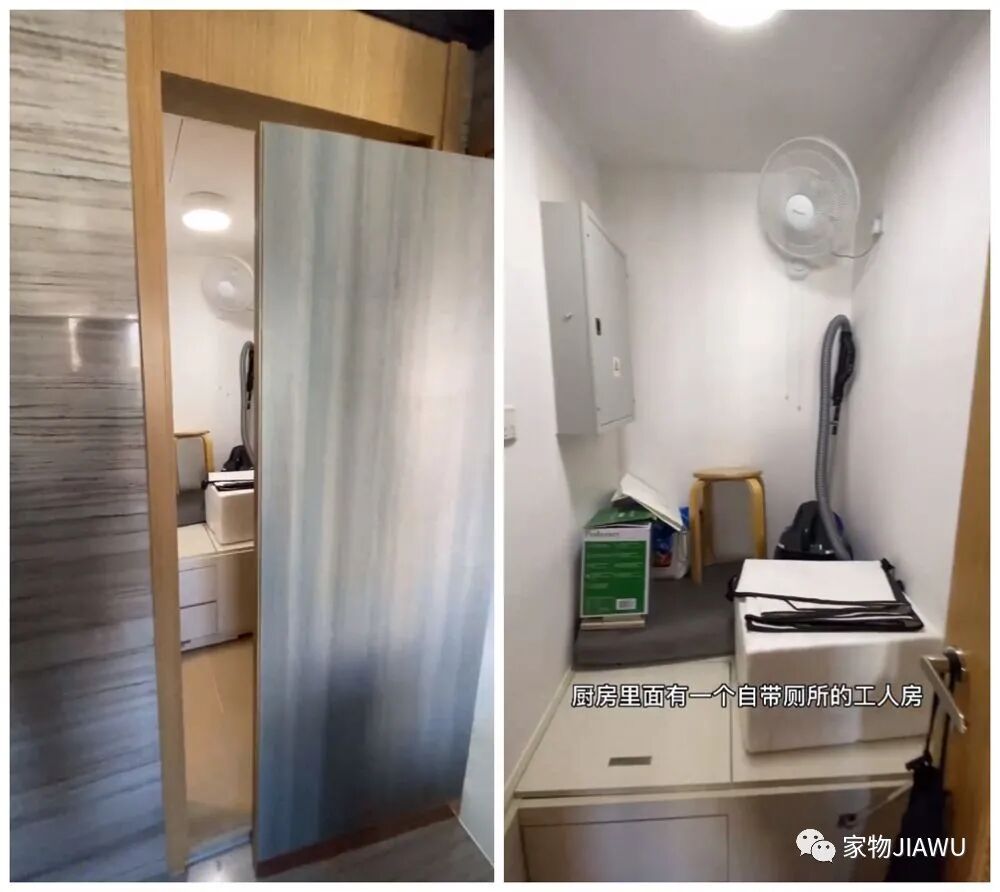 和很多户型不同的设计是厨房门后的一个小空间,这里和厨房相互连接,是家里的阿姨房,如果家里有保姆或者帮工的话,可以住在这个小区域里。