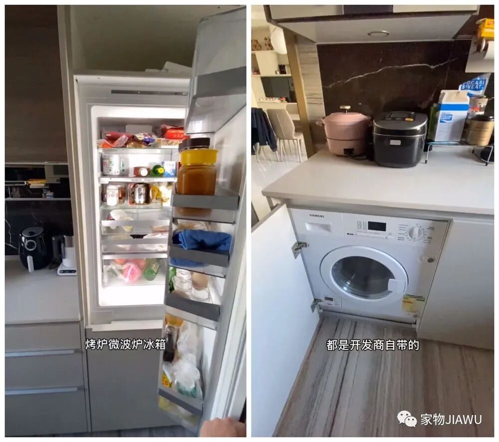 冰箱、洗衣机、烤箱等设备,要么隐藏在橱柜中,要么和橱柜做成了同一颜色的面板,嵌入到橱柜中后,看上去一体感更强。