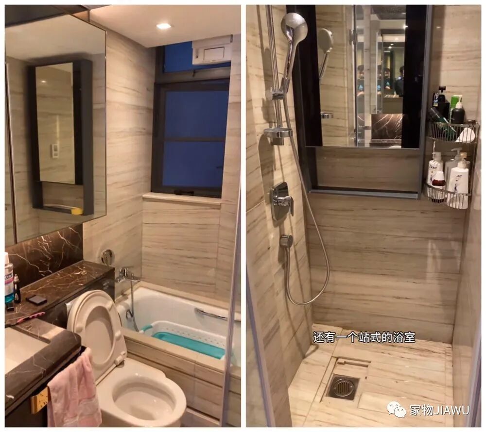 主卫是一间明卫,空间不大,但巧妙利用格局做出了“不完全”的干湿分区设计,马桶和浴缸相连,旁边是洗手池,而浴室则在一个单独的小空间中,空间分配倒也合理。