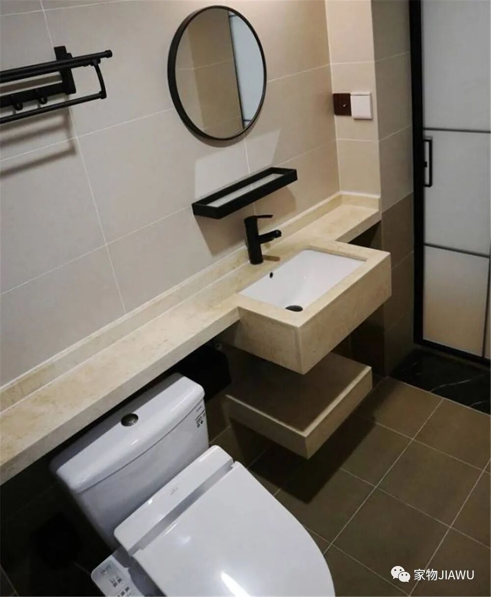 之前装修的时候没想那么多,后来看过很多人家里装修的案例后,才发现洗手台完全可以延伸到马桶上方,提供额外的置物区。