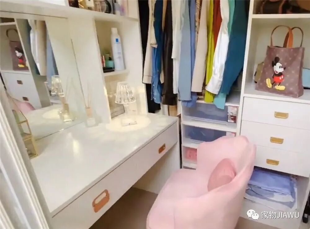 这个小空间不仅能当做衣柜,收纳姑娘的各种衣物,同时化妆桌也提供了梳妆护肤、工作学习的区域,空间利用非常合理。