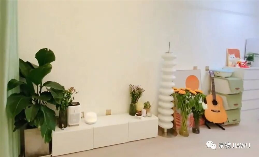 电视墙一侧,电视柜、绿植、收纳柜,共同组成一幅“小清新”的画卷,看上去颇具温馨素雅质感。