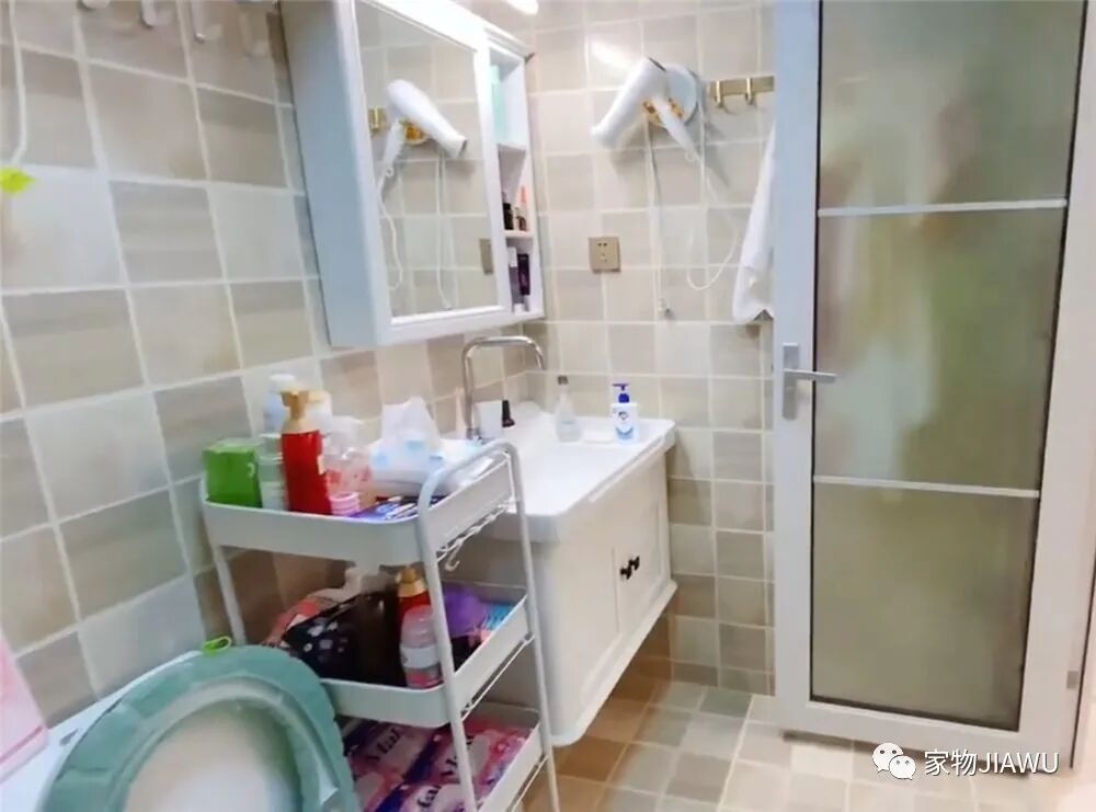 卫生间内,悬空式的橱柜内可以收纳足够多的清洁和洗漱用品,旁边的三层架也扩充了卫生间内的收纳。