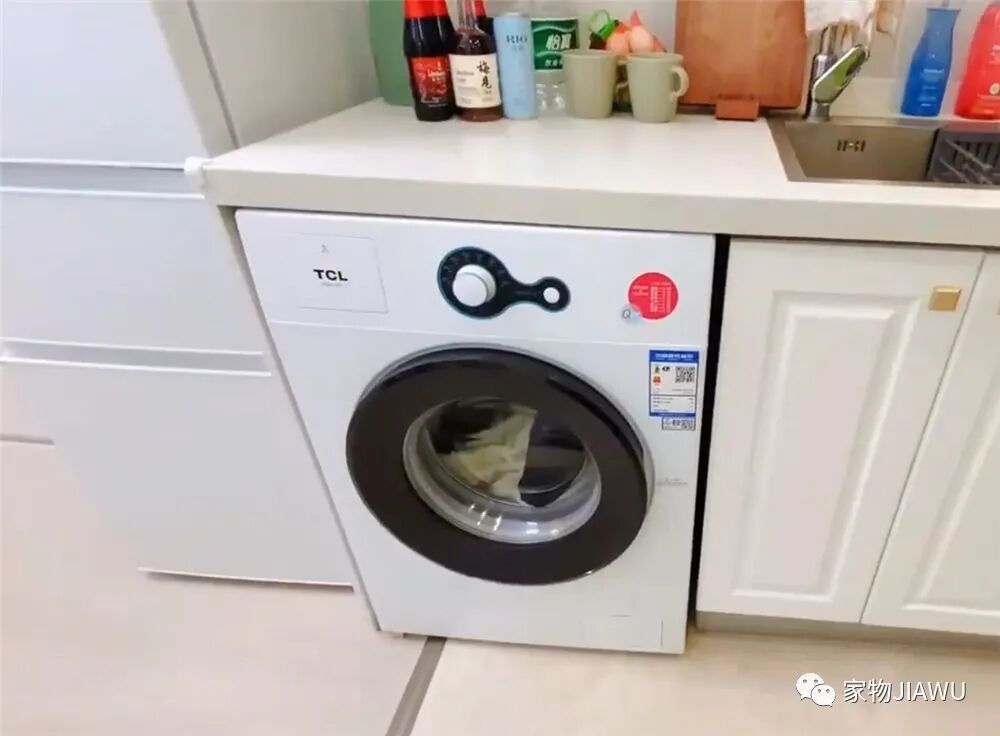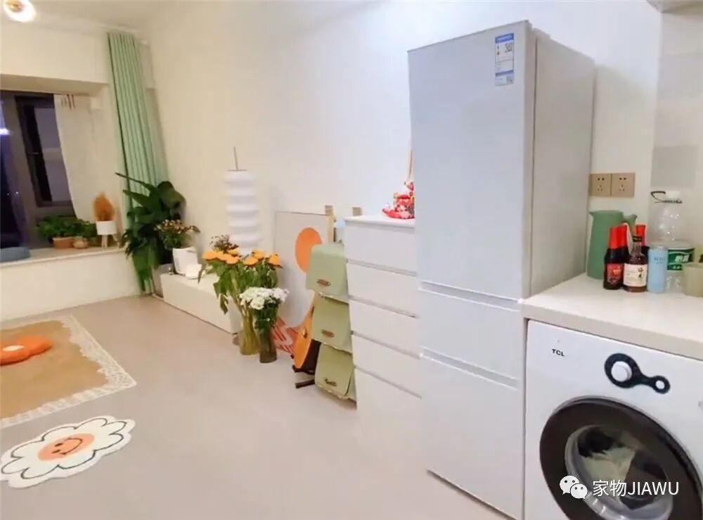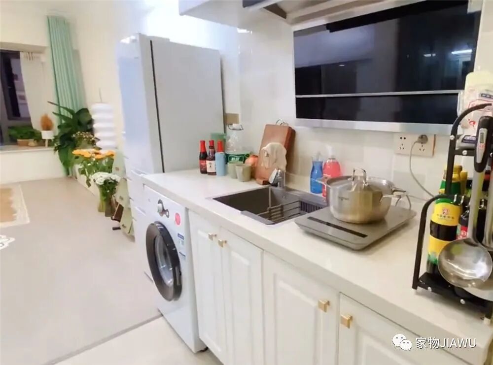 哦对,和许多小公寓一样,洗衣机被嵌入到了橱柜线下方,不仅方便了日常的衣物清洗,同时也不会占用太多空间。