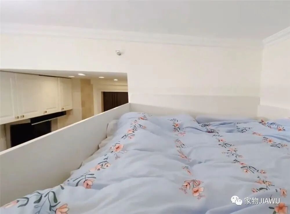 而最吸引人的,当属客厅旁边方方正正的“盒子”,这其实是姑娘自己设计的阁楼卧室,虽然室内层高只有2米9,但她还是做出了这个夹层卧室。