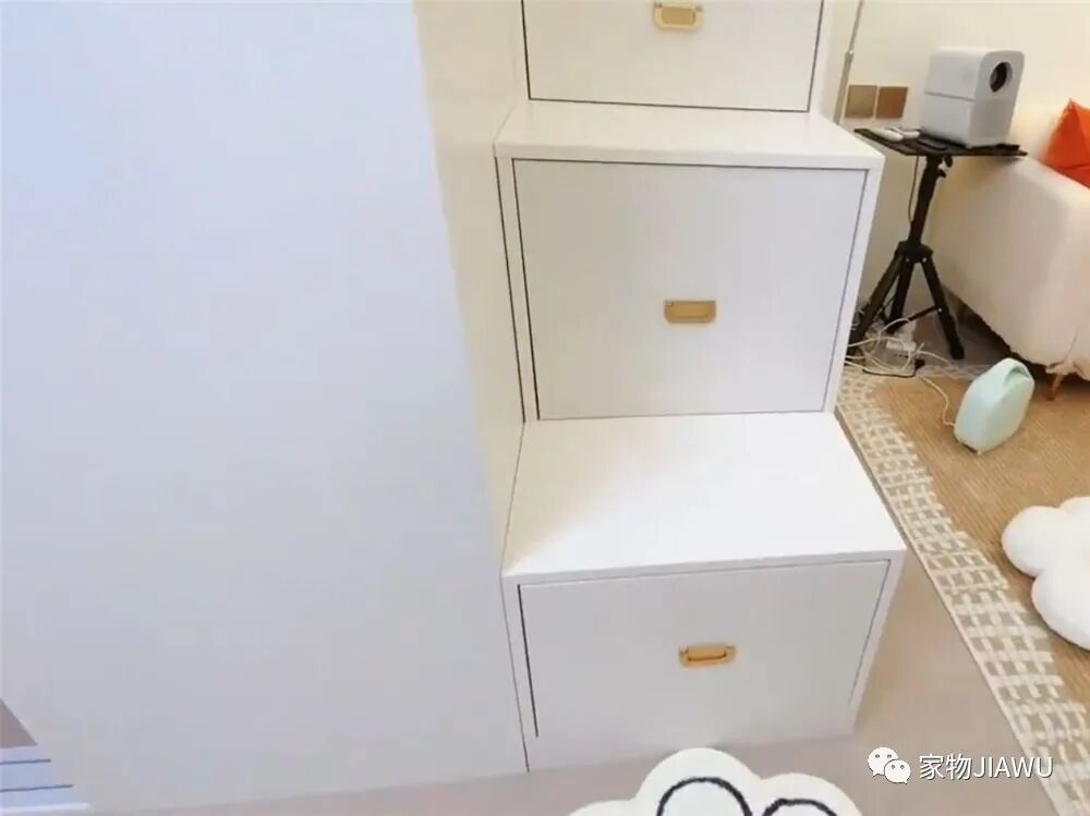利用2米9的层高,姑娘勉强做出了夹层卧室,步入卧室的楼梯都被她做成了一个个的收纳抽屉,提升小户型的收纳能力。