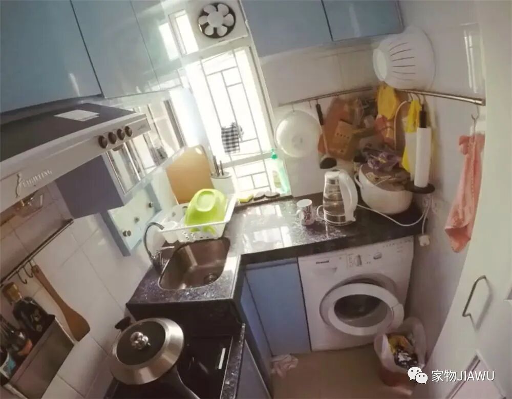 同时,底柜嵌入了洗衣机,其实并没有多少空间,餐具厨具收纳,大多靠吊柜完成。